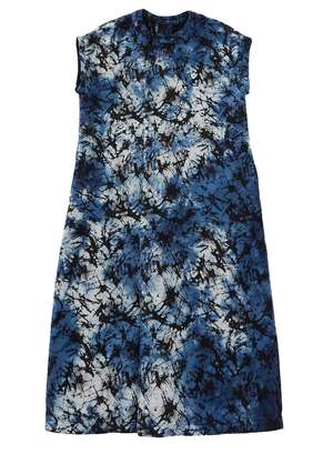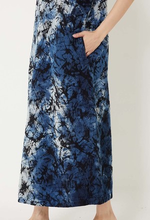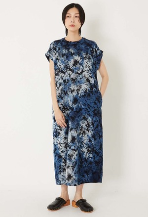An off-the-shoulder sleeveless dress featuring a distinctive hand-dyed indigo glass jacquard pattern. Crafted from soft 100% cotton, the fabric showcases a beautifully textured, uneven surface created through a traditional shibori indigo rubber lacquer technique. The moderately off-cut silhouette elegantly frames the shoulders, while delicate knot decorations inspired by Mizuhiki cord add refined detail. Each piece is individually hand-dyed by Japanese artisans, ensuring unique indigo variations. Made in Japan. 100% cotton. Made in Japan. Size S: Length 120 cm / Width 56 cm / Center of back to sleeve tip 31 cm Size M: Length 125 cm / Width 58.5 cm / Center of back to sleeve tip 34 cm Model height: 164 cm, wearing size S. Precautions: This product is made with indigo-dyed material, so the color will fade from dark blue to light blue with repeated wearing and washing. Avoid wearing it with white or light-colored items or layering it with other items as the color may transfer. Please wash it alone as the color may fade during washing. Store it away from light. If left folded, the creases may fade.