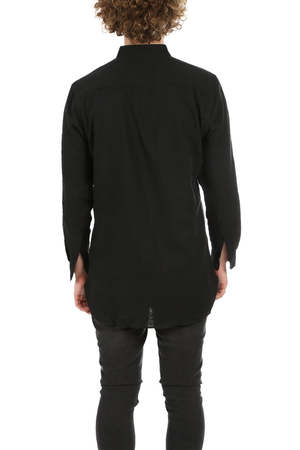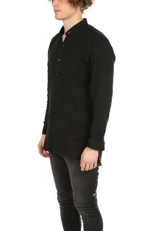 Our very own update on the classic button down silhouette. A sophisticated mandarin collar portrays a clean formality without the discomfort and hassle of a tie, while a soft breathable cotton feels as if your'e cheating the look of a structured well-tailored shirt. - Color: Black - 100% Cotton - Made in USA - Machine wash cold * Model is 6'1" wearing size L Productcode BCSHIRT-100 Designer BLUE&CREAM