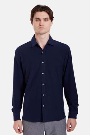 Introducing the Elyonan elevated essential that carries the same shape as our Dre Piqu classic button-up, but with added stretch for comfort and a sleeker look. It maintains a super-soft hand against the skin and is designed to be worn untucked. - Color: Navy - Details: Button-up closure, classic spread collar - Made in NYC - Composition: 58% Cotton, 37% Polyester, 5% Spandex - Care Instructions: Machine wash cold, wash separately, do not bleach, do not tumble dry, lay flat to dry - Style #: WVBCM2488T-RJ MPN WVBCM2488T-RJ SKU BCMF25-14