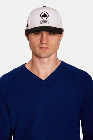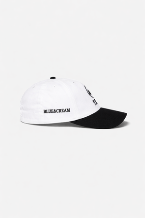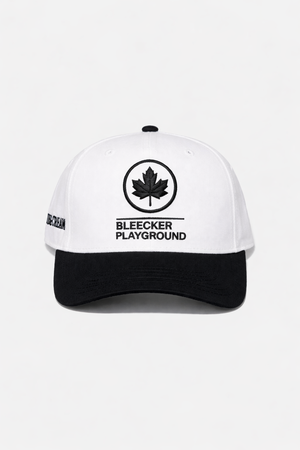 The Bleecker Playground Snapback Cap by Blue&Cream features a white base with black font. Style #: BCMSP26-01.