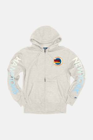 This cropped zip-up hoodie features a retro runner logo2, bold Hamptons and New York sleeve graphics, drawstring hood, side pockets, zip closure, ribbed hem and sleeves, and B&C We Run graphic on back and chest. Color: Oatmeal SKU: BCMSP25-52