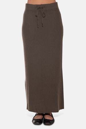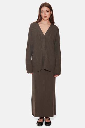 Indulge in warmth and style with our Lucy ribbed cocoon cashmere cardigan. The Lucy highlights a long silhouette, a chic V-neckline, and a timeless 4-button closure. Made from the softest cashmere with a ribbed texture throughout the body and sleeves. - Color: Tarnished - Luxe ribbed cashmere knit - Relaxed oversized fit - Drop sleeve shoulder - V-neck - Elasticated waistband with drawstring - 100% Cashmere Care Instructions: - Dry clean only - Do not machine wash or tumble dry The Gertrude Ribbed Maxi Skirt feels like a hug with its luxurious fit and feel. Look elegant and sophisticated while feeling warm and fuzzy. Made from a ribbed cashmere fabric that drapes effortlessly for a perfect fit and length. Fitted waist made with stretch and drawstring option for you to adjust to your perfect fit.
