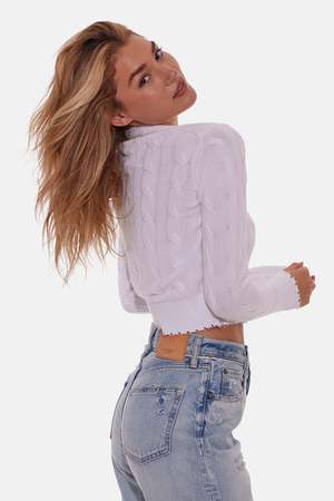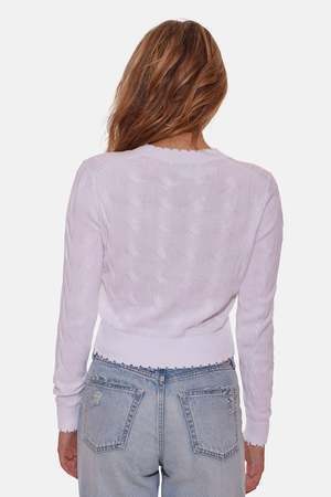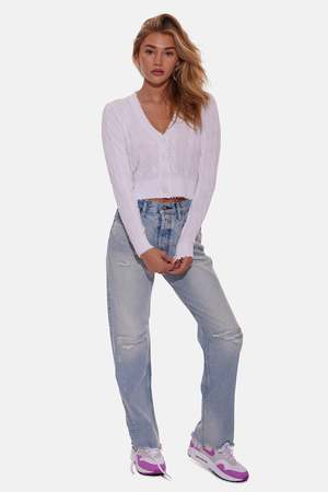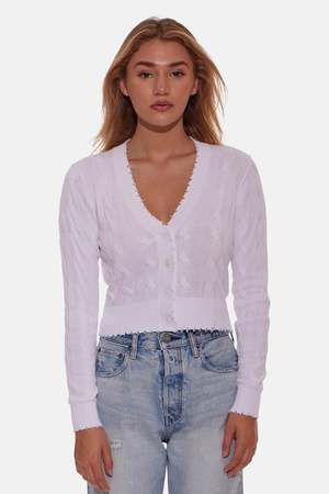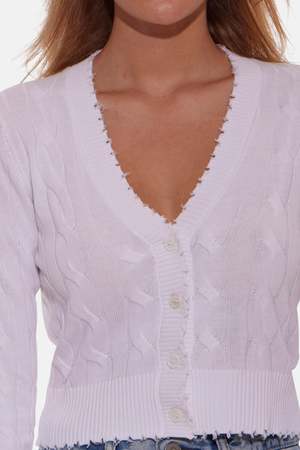 Introducing the our Satya V-Neck cardigan, featuring a unique ribbed texture with frayed hem on the body, sleeves & neckline for a chic look. Perfect transition style going into the fall, made from a light weight 100% cotton. - Color: White - V-neck line - Long Sleeve - Button down closure - Frayed neck line, sleeve hem & body hem - Ribbed texture down the body & sleeves - 100% Cotton - Style #: 8138BC CARE INSTRUCTIONS: - Machine Wash cold - No Bleach - Tumble Dry low - Lay flat to dry Mpn 8138BC Sku MINWPF23-19