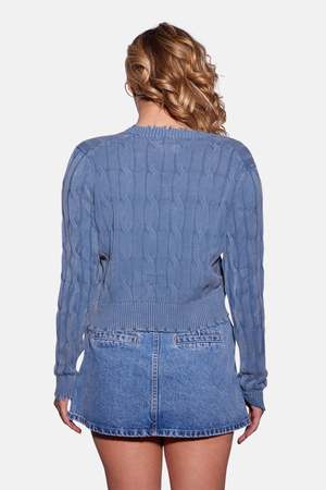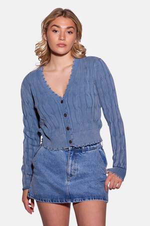 Vintage-inspired and effortlessly cool, the Stone Wash Distressed Cable Cropped Cardigan features a soft, cable-knit texture, a gently cropped silhouette, and raw distressed edges. Giving an effortlessly worn-in vibe with a vintage feel and a feminine twist, this cardigan is perfect for all-season wear. - Color: Fresco Blue - Composition: 100% Cotton - Dry clean or hand wash - Do not tumble dry - Rib at sleeve and hem - Lay flat to dry - Style #: 8829BC-465
