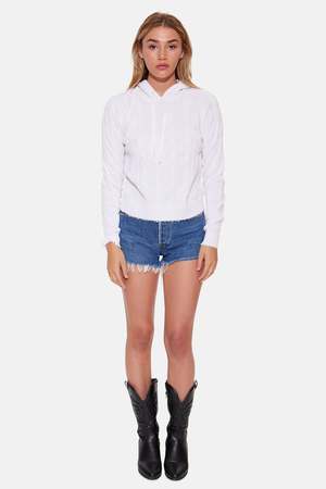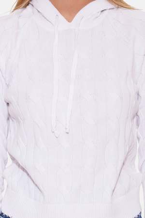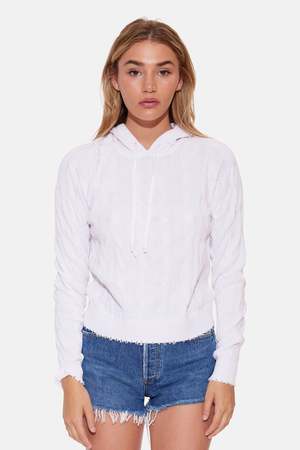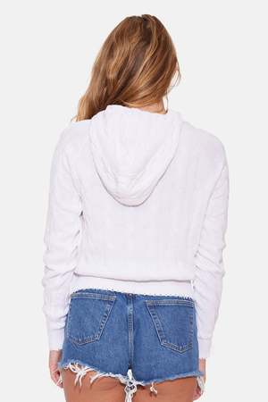 Introducing the enchanting "Amber" cable knit hoodie, a delightful blend of coziness and charm. The lightweight sweater is crafted with a delicate cable knit pattern, frayed sleeve & body hem providing a touch of extra layer of cuteness to your outfit - Color: White - Long Sleeve - Hooded pull over - Cable Knit patern - Frayed sleeve hem - Frayed body hem - V-neck line - 100% Cotton - Style #: 8137BC CARE INSTRUCTIONS: - Dry Clean recommended - Hand wash in cold water - Do not wring, Do not bleach, Do not tumble dry - Warm iron in reverse - Reshape and dry flat Mpn 8137BC Sku MINWSU23-19