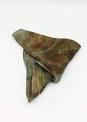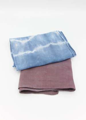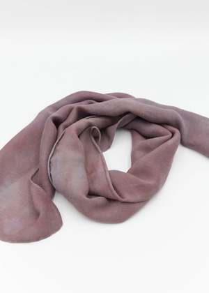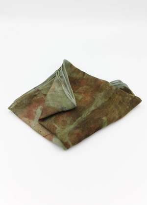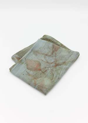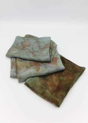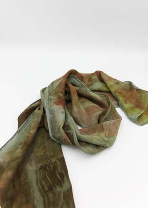 80% Silk, 20% Merino Wool. Leslie Burchel-Fox uses all natural botanical dyes to create one of a kind wearable art. These lightweight super soft scarves are a blend of silk and wool. What is Eco-Printing? Eco-Printing is an ecologically conscious way of applying print and color to protein (silk/wool) and cellulose (rayon/cotton) based textiles. Without the use of powdered mordants - which are harmful to the environment, one-of-a-kind patterns are achieved through using materials that encourage the color and patterns to emerge. Onion skins and eucalyptus leaves help to create the basic pot "soup." Leaves, flowers, and other botanicals are placed on the fabric, rolled onto a metal pipe and boiled for hours. The results are always surprising, mysterious, and a treat for the eyes. #6 & #7 - 8x50 #8, #9 & #10 - 8x54