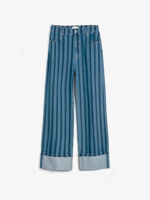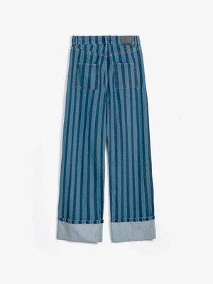 Blue striped wide-leg denim pants designed for a relaxed fit with a mid-rise and non-stretch fabric, finished with pockets. Fits true to size; take your normal size. For a slouchier fit, size up. Composition: 100% Organic Cotton. Model is 176 cm / 5'9" tall and is wearing size S. Made in Portugal.
