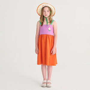 Woven dress with a colour-blocked design and pixel daisy print on the chest. Features button closure down the front, a gathered skirt, and wide straps. 100% Organic Cotton Machine wash at 30C on gentle cycle. Do not tumble dry or dry clean.