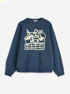 Navy blue sweatshirt designed for a relaxed fit in a stretchy fabric. Fits true to size; take your normal size. Composition: 66% Organic Cotton, 22% Recycled Cotton, 12% Cotton. Model is 175 cm / 57.4 tall and is wearing size M. Made in Spain.