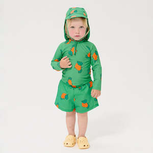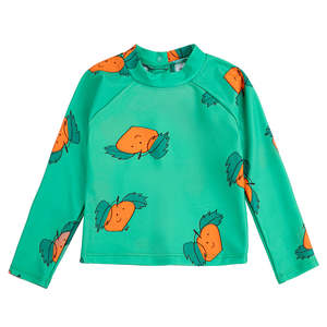 Bobo Choses was created in 2008 to offer a friendly clothing brand that speaks to children in their own language. They celebrate being kids stuck inside adults; acting seriously funny and caring for the world and everything that is part of it. "Pickles" is a nostalgic lifestyle collectsion inspired by slow, rebellious summers, celebrating countryside adventures, berry-stained hands, and the joy of imperfect, playful moments. Rooted in curiosity and storytelling, Pickles captures the beauty of slowing down, savoring summer, and finding adventure in the everyday. - Swim shirt - All-over tangerine pattern - Snap closure at the back - Long raglan sleeves 81% Recycled Polyamide, 19% Elastane Machine wash at 30C on gentle cycle. Do not tumble dry or dry clean. Style: B126AB106 Type: Swimwear