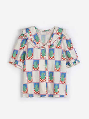 The Pear Collar Shirt in Ecru Multi from Bobo Choses is a playful everyday blouse crafted from lightweight cotton. Cut with an easy, relaxed shape, it features a soft ruffled collar, short sleeves, and a button-through front. The colourful pear and check print adds character, while the breathable fabric keeps it comfortable and effortless for warmer days. - 100% Cotton - Lightweight woven fabric - Relaxed fit - Ruffle collar detail - Button-through front - Short sleeves with soft gathers - All-over pear graphic print - Made in Spain - Stock Code_AD021