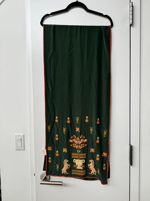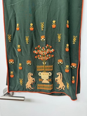 This style is inspired by a beaded vintage scarf. We reproduced the beadwork with figures from an embroidery sampler worked in 1789. This scarf is hand-beaded with orange-and-yellow flowerpots, trees, and horses. 100% silk Made in India Dry clean only Brand new - bought for an event and didn't end up wearing!