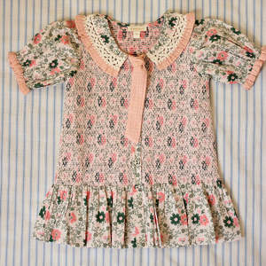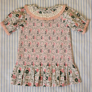 From Bonjour. Kid's short puff sleeve tunic top with elastic stitches in front and back. Fabricated in a sweet prairie floral print voile and finished with blush pink ruffle trim, tie, and ivory embroidery. - Kid's tunique top - Color: Prairie In Bloom - 100% organic cotton voile - Split collar with contrast embroidery and ruffle trim - Puff shoulders - Attached neck tie - Short sleeves cinched at cuffs and edged with ruffle trim - Dropped waist - Gathered flounce at hem
