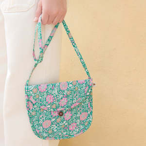 Quilted mini purse with an all-over floral print. Features a long shoulder strap and a flap with button closure. 100% Cotton Style code: BC99012-906.