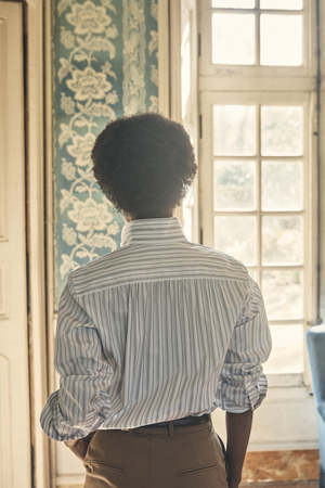 Crisp, cool white and khaki striped cotton poplin. Long, lean cut with fitted shoulders and set-in sleeves. Shirring at back yoke and cuffs. Hidden placket at centre front and sleeves. Tall stand collar can be worn upright or with the tips pressed back. Softly sloping shirt tails with side seam tabs and the Roman numerals VI at the right side. French seam construction. 100% cotton, made in Romania. Delicate machine wash. Size 36: Back Shoulders: 16.75" Neck: 14.5" Bust: 41" Hip: 42" Sleeve length: 23.5" Cuff: 8" Length from front shoulder to hem: 27.5" Size 38: Back Shoulders: 17" Neck: 15" Bust: 42.5" Hip: 44" Sleeve length: 24" Cuff: 8.25" Length from front shoulder to hem: 28" Size 40: Back Shoulders: 17.25" Neck: 15.25" Bust: 43" Hip: 46" Sleeve length: 24.5" Cuff: 8.5" Length from front shoulder to hem: 28.5" Size 42: Back Shoulders: 17.5" Neck: 15.5" Bust: 44.5" Hip: 48" Sleeve length: 25" Cuff: 8.75" Length from front shoulder to hem: 29" Also available in KHAKI GREEN