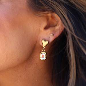 The Brighton Earrings bring a playful twist to bold styling with heart-shaped gold studs and dangling emerald-shaped cubic zirconia charms. Perfect for dressing up the everyday. Bold yet flirty, and undeniably fun to wear.
