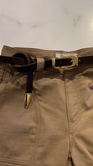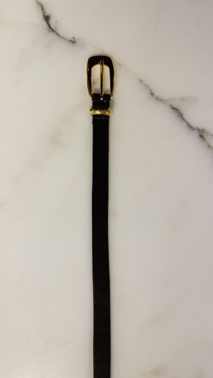 Brown long slender gold tipped belt, with a slim classic gold buckle.