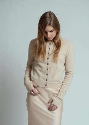 Brazeau Tricot's Mini Royal Cardigan is the perfect cashmere cardigan and features a button front and long sleeves with thumb holes. Details - Button closure - Long sleeves with thumb holes - Dry clean - Imported Color: Blonde. 100% cashmere. Style 8046PS26.