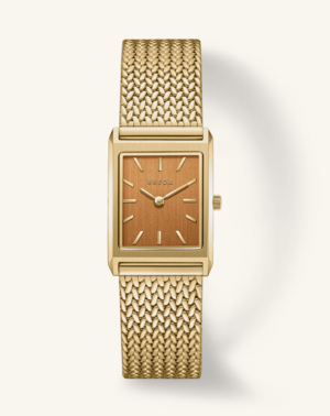 The Virgil (Tethered) Small features a compact 20mm rectangle case with an ochre brushed dial and a woven mesh bracelet that fastens with a quick release clasp. - Style #: 1758c - 18K Gold-Plated Case - 20mm Case - 18K Gold-Plated Band - 16mm Band - 3ATM Splash-Resistant - Japanese-Made Miyota Quartz Movement