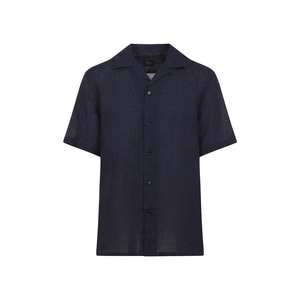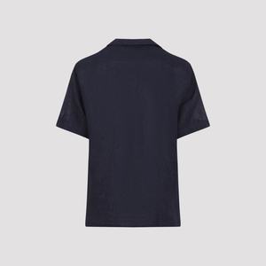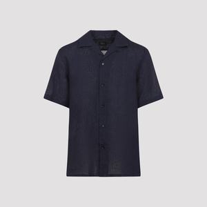 Men > Clothing > Shirts Brioni Cuban navy blue linen shirt crafted from navy blue linen, featuring a bowling collar, front button fastening, short sleeves, and a straight hem.