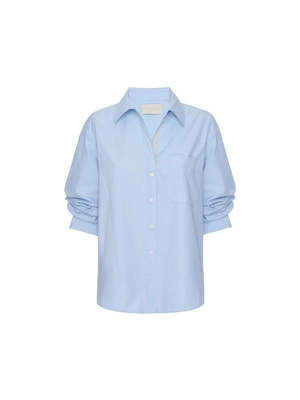 The Brochu Walker Pia Shirt in Oxford Blue combines effortless style with everyday comfort. This button-front shirt features a slightly relaxed silhouette, perfect for an easy, flattering fit that runs true to size. Distinctive details include pre-styled scrunched sleeves, grosgrain trim along the front placket, and a convenient locker loop at the back neck. Crafted from a durable 65% polyester and 35% cotton blend, it is designed for both durability and comfort. A versatile wardrobe essential that transitions seamlessly from casual to polished looks.