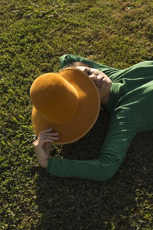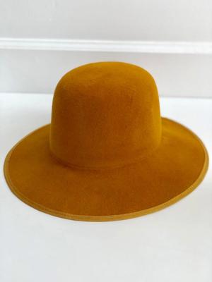 The Violetto hat by Brookes Boswell has an open round crown with a 3.5" grosgrain edged brim. A very elegant hat, this style comes in "autumn" yellow colored high quality velour fur felt, which has a short nap and is very soft. Note: Please measure your head carefully before ordering and email shop with any questions. Sizes available: S (22") M (22.5")