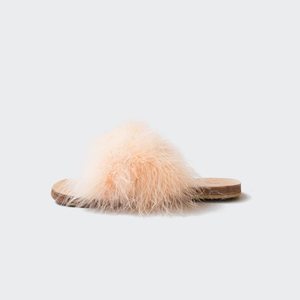 Open-toe sandals with crossover straps and feather accents.We recommend sizing up. DETAILS Marabou feathers on a calf leather base