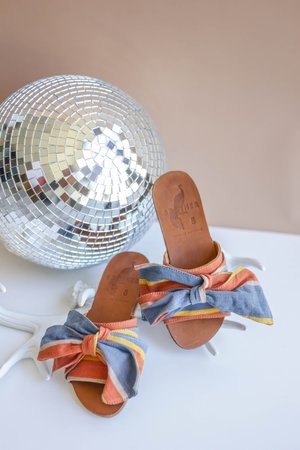 Signature Burkina slides have landed in new papaya and denim blue stripe. With a versatile, floppy bow that reties to suit your every look. Burkina slides feature upper fabric handwoven in Burkina Faso in local patterns by a marginalized community of female weavers, and are finished in Ethiopia with a lightweight, vegetable-tanned, handmade leather lining and sole.