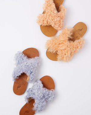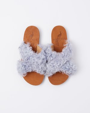 Brother Vellies Lamu Sandal in lavender curly goat shearling. Signature cross-front flat sandal with lightweight leather upper with naturally dyed goat shearling at straps, nude vegetable-tanned leather sole and recycled rubber sole. Brother Vellies shoes are handmade from bi-product of environmentally conscious materials. Because of this, no two pairs will ever be identical. Fit: True to size, half sizes should size up Material: Leather Origin:Ethiopia Care: Professional clean Why we Covet: Sustainably made, ridiculously comfy, and super cool Also available in: Melon
