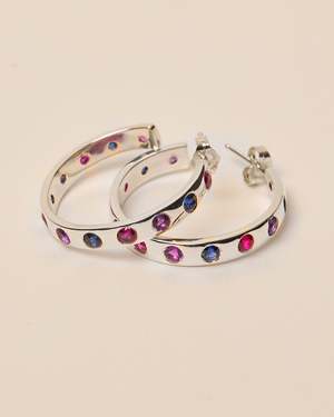 Made in 925 Sterling Silver. Set with Rubies, Sapphires, and Amethysts. Each stone is 3mm diameter. Hoop size 28mm. Google product category 188