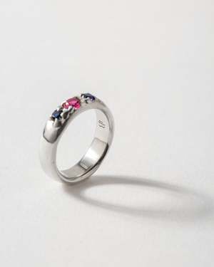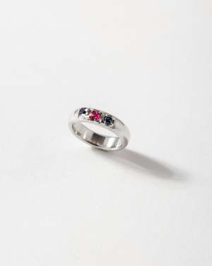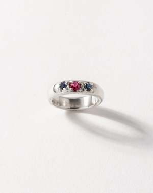 One of a kind ring. Handmade in 925 Sterling Silver. Set with 2 (3mm) Sapphires and 1 (4mm) Ruby. Size 5.5