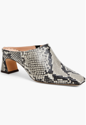 A tapered silhouette with a softly blunted, squared-off toe emphasizes the angularity of this Italian made mule lifted by a sculpturally slanted block heel. 2" heel Cushioned insole Leather upper, lining and sole Made in Italy.