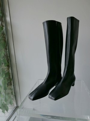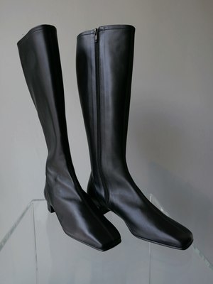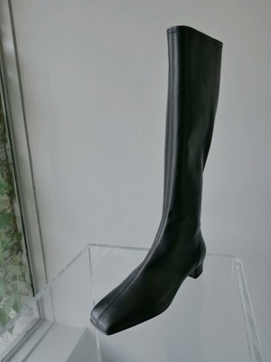 The Edie Boot by BY FAR is a knee-high style crafted from smooth LWG-certified leather with a glove-like fit. Features an elongated square toe and a low block heel, creating a sleek, minimal silhouette that elongates the leg. Italian and European sizing. Fits true to size. Heel height measures approximately 1 inch.