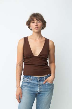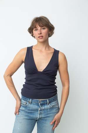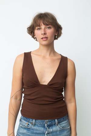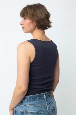 Sleeveless top with a deep neckline and pleat-details for an effortlessly perfect and comfortable fit. Made from 100% organic cotton, medium weight baby-rib fabric. Responsibly manufactured in Turkey.
