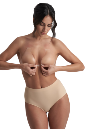The Bye Bra Silicone Bra Cups provide a perfect solution for strapless, backless, and plunge outfits. The central front closure creates a push-up effect for your desired shape, making these cups a great solution for smaller breasts. These adhesive cups are made from 100% silicone for hypoallergenic needs. With proper care, they can be used up to 50 times. Care: Hand-wash the bra with warm water and mild soap after each use and let it air dry. Once dry, cover with the protective film. Composition: 100% Silicone.