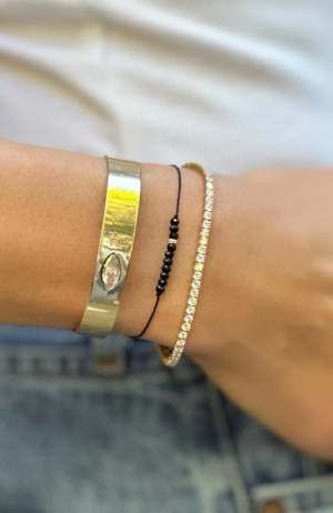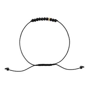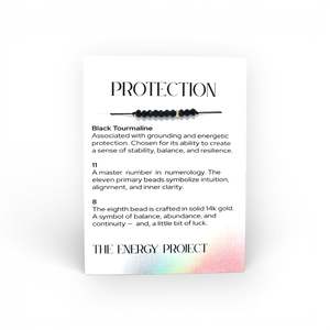 The Energy Project Protection bracelet is handmade in NYC and features 10 faceted Black Tourmaline beads and a single 14k yellow gold diamond-cut bead, strung on black nylon cord for a total of 11 beads. Black Tourmaline is known for repelling negative energy and promoting emotional stability. The bracelet is finished with an adjustable slide closure (One Size Fits Most).