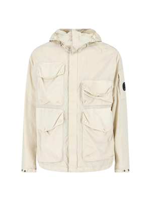 Men > Clothing > Coats & Jackets Jacket "Flatt Nylon Goggle" by C.P. Company in cream nylon with a hood, zip closure, long sleeves, Goggle lens detail on the hood, four front pockets, one side pocket with lens, and a straight hem. Composition: 100% Polyamide