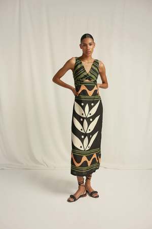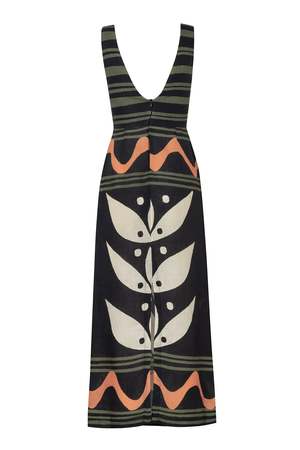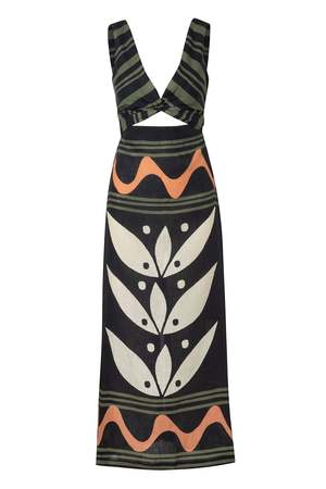 Cala de la Cruz's Simone Dress features a deep v-neck front cut-out long dress with pencil skirt and fitted entwine bodice, with wide straps. Product Details Designer ID: 23A318 Color: Lotus Composition: 100% Linen Imported