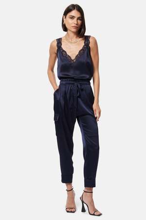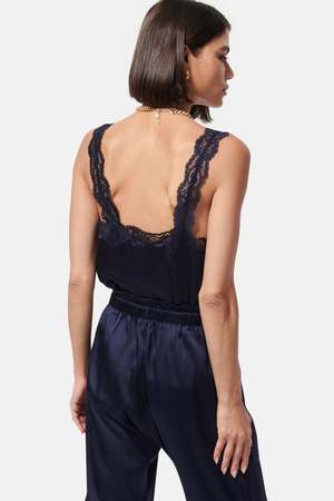 - Navy - Silk Sandwash Charmeuse - 92% Silk, 8% Spandex/ 100% Nylon - Bra-friendly - Lace detail at neckline and straps - Side slits at the hem - Unlined - Dry clean & steam only - Imported - Style #: U23-C04 Mpn U23-C04 Sku CAMWRS24-04