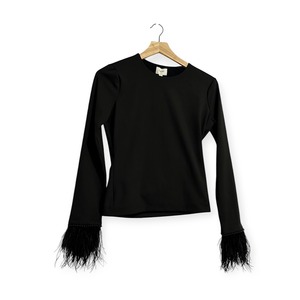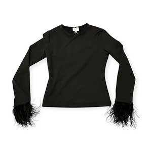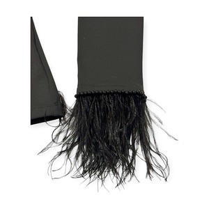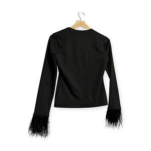 Long sleeve jersey top with ostrich feather trim. Cropped length. Crew neck. Long sleeve with beaded feather trim at the cuff. Polyester, Spandex, Ostrich feather. Lined. Dry clean & steam only.