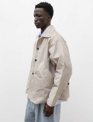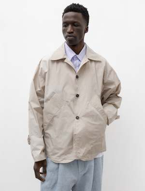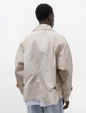 An oversized cropped rendition of a classic MacIntosh coat cut from a lightweight, crispy, Italian nylon in sand beige. Features a large Mac style collar, angled front pockets with oversized exposed welt openings, and button fastening adjusters at the sleeve and the back waist. Camiel Fortgens signature deconstructed finishing presents as exposed pocket bags at the front that are intersected by topstitching at the hem and closure, uneven hems, raw edges at details, and the now classic wavy topstitching throughout. Constructed with french seams for an elegant, durable finish; Italian buffalo horn buttons. - Made in Portugal - 100% nylon - Oversized - Hand wash - JAMES IS 6'1", 145LBS AND WEARS SIZE Medium