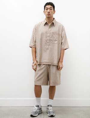 Wide fitting knee length shorts cut from a soft jacquard check in a mixed brown. Minimally detailed with front on-seam pockets and an elastic waistband with a toggled drawstring. The generous leg opening creates a flared a-line silhouette that elegantly moves about the leg when worn. Completed with Camiel Fortgens signature deconstructed detailing featuring exposed edges at the waist band and loose threads throughout. - Made in Ukraine - 88% cotton, 7% tencel, 5% linen - Wide leg - Hand wash, line dry - SASCHA IS 6', 180LBS AND WEARS SIZE Large