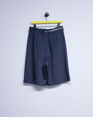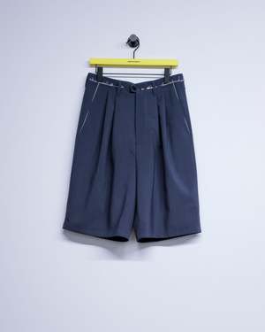 Knee-length, straight-legged shorts with pleated front and dropped crotch. Zip fly with black horn top button closure. Slip side pockets with visible lining details. Deconstructed waistband. Single welt pocket at the back. Belt loops. Tropical wool construction. Style type: Shorts.