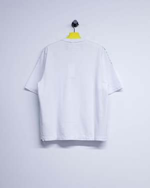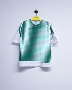 Oversized short sleeve T-shirt in heavy jersey with a crew neck collar, raw details, and irregular topstitching. Features a silk-screened green stripe placement print. Please note: each T-shirt has a slightly different print outcome due to the individual screen-printing process.