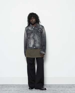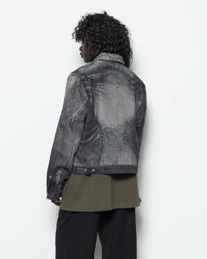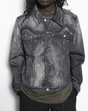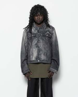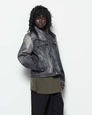 The Distorted Print Denim Jacket is a relaxed-fit cotton-blend denim jacket featuring the brands signature trompe-l'il digital print throughout. It is fitted with a pointed collar, silver-tone button closure, barrel cuffs, flap pockets and welt pockets, and adjustable button tabs at the back hem. - 76% Organic cotton, 24% Recycled cotton. - Made in Portugal. - Machine wash cold, line dry. Sebito is 5'9 (175cm) and is wearing a size S.