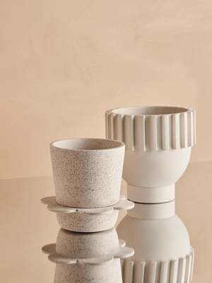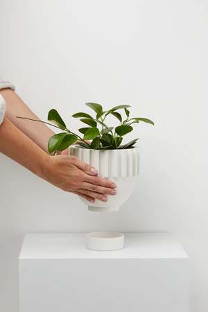 MODERN INDOOR PLANTER OVERALL SIZE Height: 7.87" Width: 7.48" POT SIZE Height: 6.69" Inside Diameter: 6.30" Outside Diameter: 7.48" TRAY SIZE Height: 1.18" Inside Diameter: 3.54" Outside Diameter: 3.94" ABOUT With its recognisable profile and ribbed surface, the Solstice Planter adds character to your jungle corner. Like a sundial, observe the sun's rays magnify your Solstice Planter and watch your plants grow in it. All Capra Designs' planters are designed with a tray so that you can pot directly into the planter and know that your plant is still experiencing proper drainage. Designed in Australia. Handcrafted from resin.