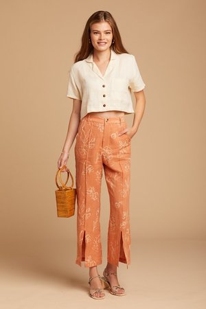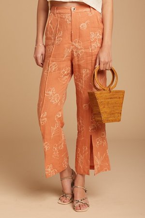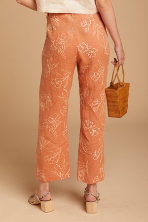 Easy linen pants with ivory floral detail. Features pockets, a tortoise button, and seams down the front of the leg that leads to a slit. Materials: 100% Linen Measurements for Size Small: Waist: 14" Length: 26"
