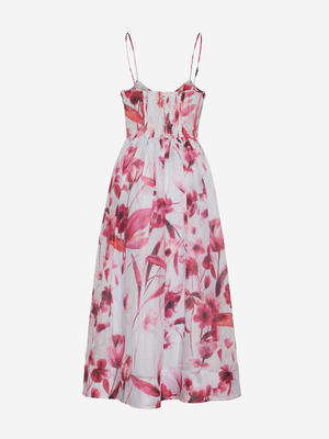 Cara Cara's Alba is a midi length fit-and-flare dress with adjustable spaghetti straps and a ruched bodice. Product Details Designer ID: 1349SLO Color: Petal Sketch Light Blue Composition: 52% Silk Organza / 48% Linen; 100% Stretch Viscose Lining Imported.