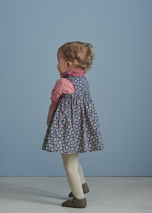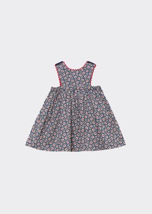 Charming and graceful baby dress with full gathered skirt and pinafore shaped top. The Jupiter baby dress is matched beautifully with the navy flower print, a Japanese fabric full of wonder and intricacy. From the base of midnight blue, detailed flowers are repeated in uniform ecru and black with leaves and stems. Alternating the repetitions in perfect symmetry are carmine red bursts of flower with indigo and squash toned leaf details set in ecru shapes. This 100% cotton dress has lovely contrasting red scallop trim around the top, scoop collar and straps. The waist has elastic for ease of wear and the top of the straps have two button fastenings in complimentary shades of scarlet. A design with a uniform print and silhouette perfect for Christmas celebrations with all the family. Outer: 100% Cotton, Lining: 100% Cotton