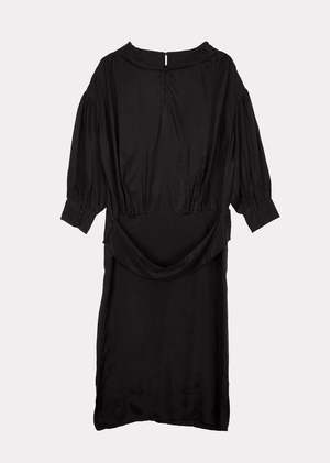 This luxuriously silky black belt dress makes everything an occasion. A nod to vintage silhouettes, our midi dress features a high cowl neckline and puff sleeves, and a frill drop-waist, to flatter.